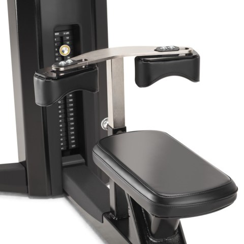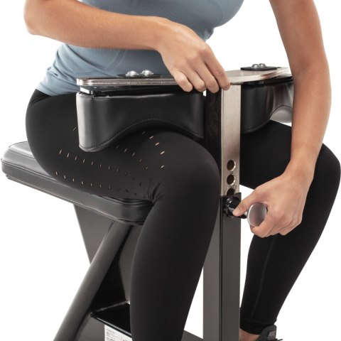 Urządzenie oferuje regulowane podparcie ud, które stabilizuje ciało w trakcie ćwiczeń i pomaga skupić się na izolowanym treningu górnych partii ciała. Dla osób chcących zwiększyć poziom trudności, istnieje możliwość wykonania ćwiczeń w pozycji stojącej, co aktywuje dodatkowo mięśnie stabilizujące korpus i dolne partie ciała, zwiększając efektywność treningu.