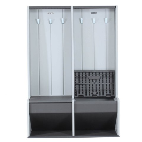 Szafka ubraniowa z ławką marki Lifetime pomoze Ci utrzymać porządek w wielu miejscach w domu. Prostota jej projektu i szary, neutralny kolor, sprawiają, że pasuje do większości wnętrz. Szafka wykonana została z polietylenu o wysokiej gęstości (HDPE), dzięki czemu jest bardzo wytrzymała i nie wymaga wkładania dużego wysiłku w utrzymanie. Dodatkowo z łatwością, dzięki specjalnym otworom w tylnej ściance, możesz przyczepić ją do ściany, aby uniknąć przewrócenia. Storage locker posiada 6 haczyków, na których możesz powiesić ubrania, 2 wbudowane półki na buty, oraz 2 otwierane ławki, które zaskoczą Cię swoją pojemnością. Szafka została skonstruowana tak, aby można było połączyć kilka z nich w jeden dłuższy ciąg. Dzięki temu z łatwością zagospodarujesz tyle powierzchni, ile tylko chcesz.