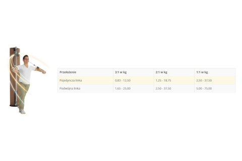 Przełożenie można zmienić za pomocą wymiany linki SlimBeam. Umożliwia to przełożenie 3:1, 2:1 i 1:1. Efektywna maksymalna masa wynosząca 12,5 kg (pojedyncze pociągnięcie) lub 25,0 kg (podwójne pociągnięcie), rozmieszczona na 15 obciążeniach, zapewnia bardzo dokładną i harmonijną gradację ciężaru.