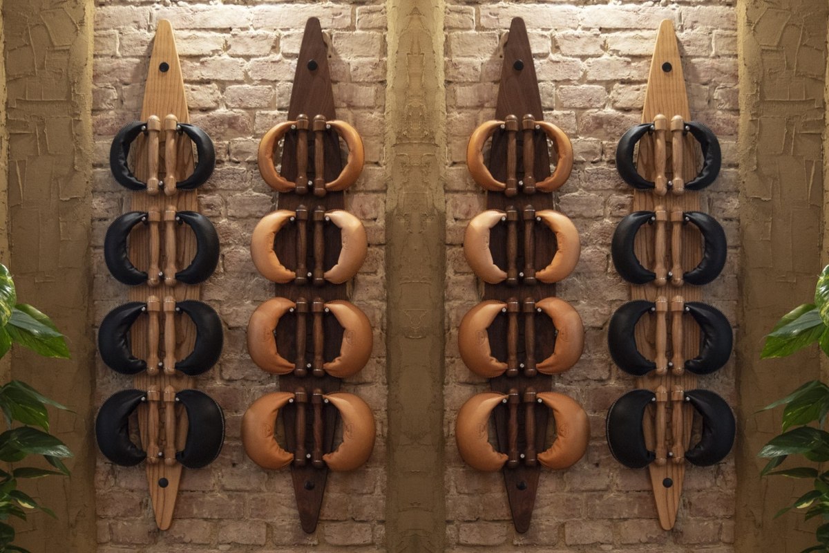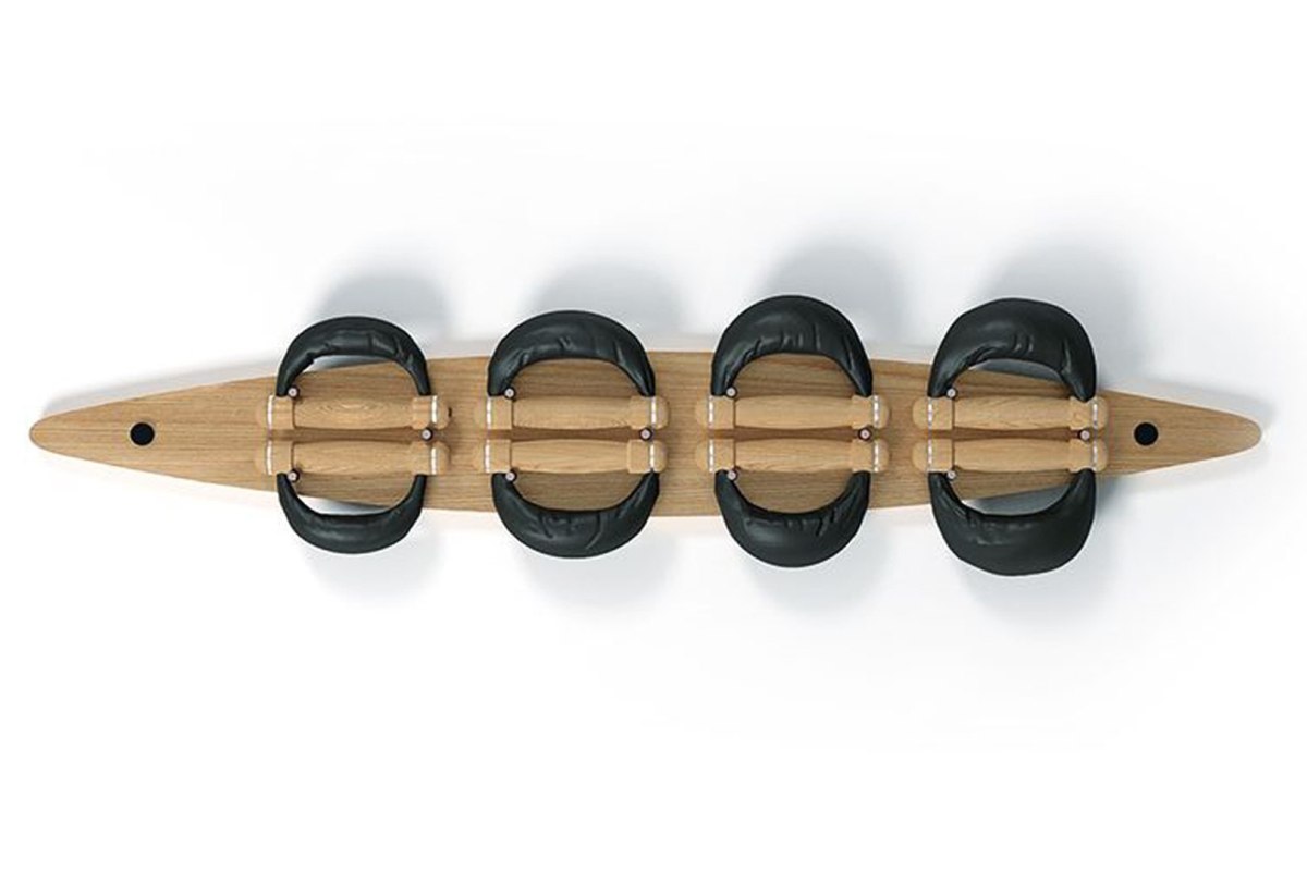 Tablica z hantlami SwingBell została wykonana z litego drewna i może pomieścić osiem hantli, czyli kompletny zestaw. 4 pary skórzanych hantli jest zawieszone na wspornikach z najwyższej jakości stali nierdzewnej. Uchwyty do hantli również zostały wykonane z litego drewna.