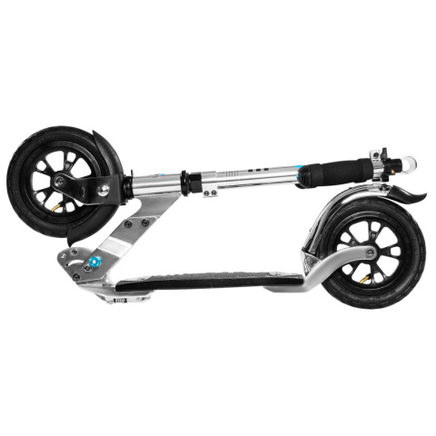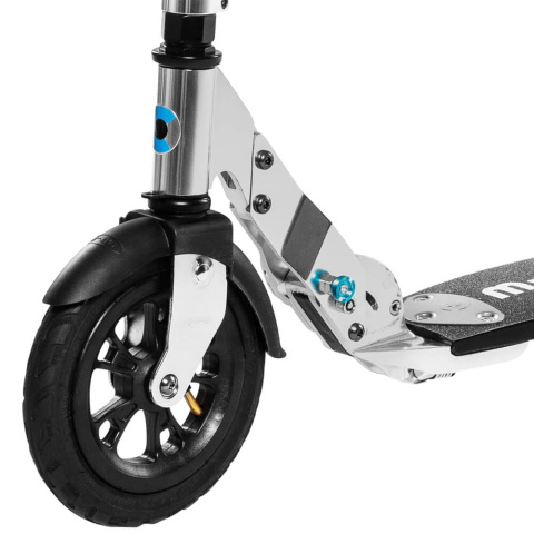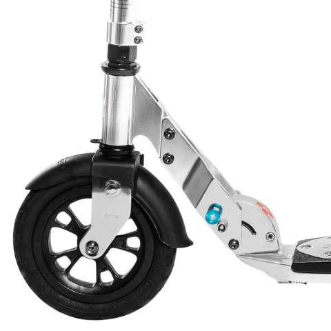 - Komfortowa jazda na każdej nawierzchni — duże pompowane koła o średnicy 200 mm świetnie radzą sobie z nierównościami terenu.
