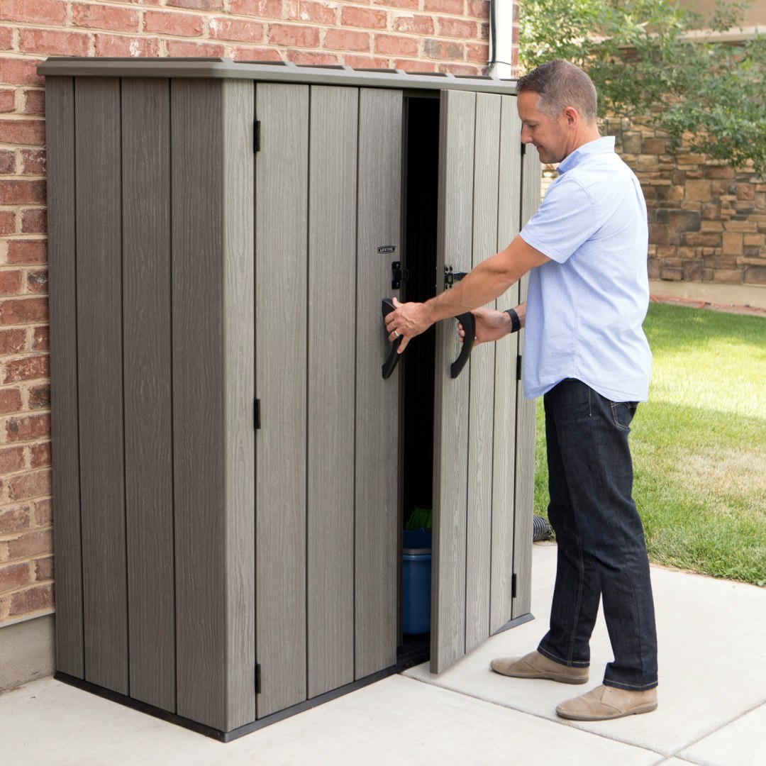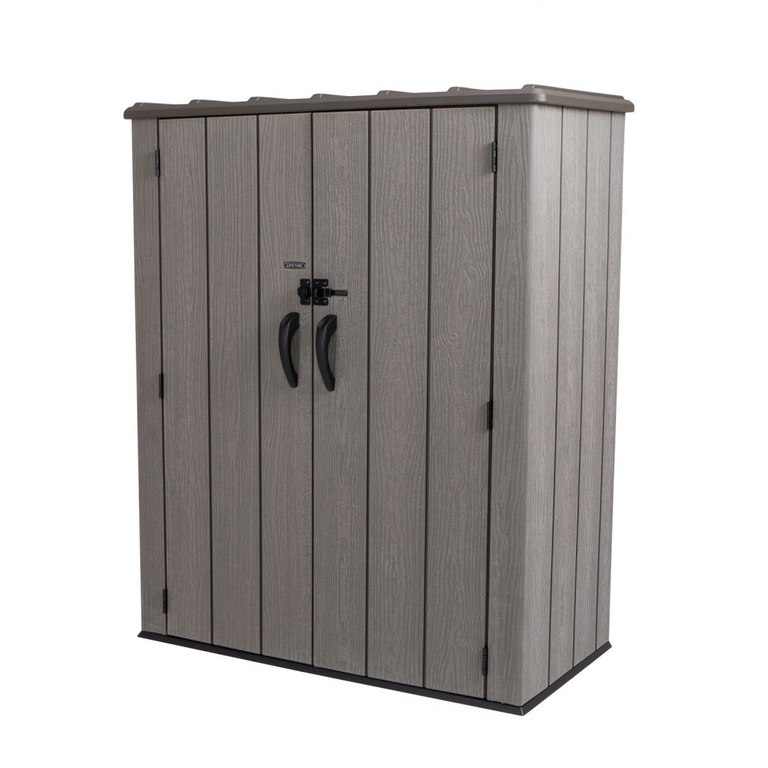 Szafa ogrodowa o wymiarach wewnętrznych 136 x 70 x 165 cm wyprodukowana przez markę Lifetime z USA to innowacyjny produkt wykonany z plastiku o najwyższej jakości - 100% polietylenu wysokiej gęstości (HDPE). Doskonałe uzupełnienie ogrodu lub przydomowego składzika, w którym na przykład można schować narzędzia ogrodowe lub drewno. Dzięki strukturze imitującej prawdziwe drewno, świetnie wkomponuje się w otoczenie.