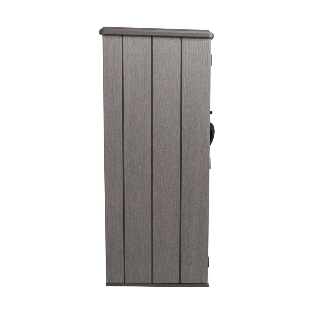FAKTURA DREWNA - Doskonała imitacja drewna sprawia, że szafa dobrze będzie współgrała z otoczeniem w ogrodzie, jednocześnie nie wymagając malowania i konserwacji.