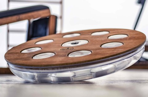 Platforma do balansowania Eau-Me Board została wykonana z wysokiej jakości drewna orzechowego. Połączenie podstawy ze zbiornikiem na wodę wykonanym z polikarbonu skutkuje skutecznym i wydajnym treningiem równowagi. Dzięki platformie Eau-Me poprawimy koordynację ruchową oraz kondycję.